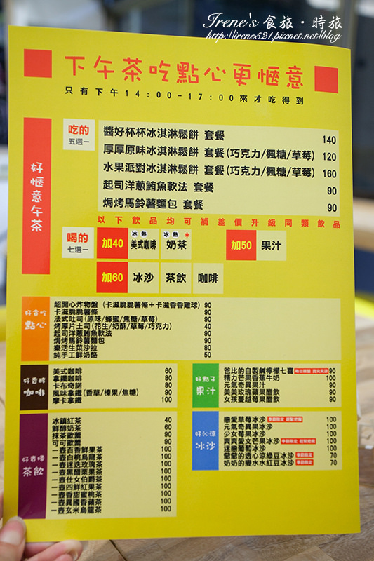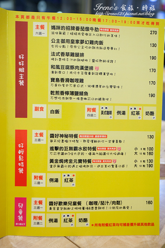 目前供應有早午餐、主餐、特餐、下午茶,除了早午餐是全日供應外,其他餐點都有供應時間。