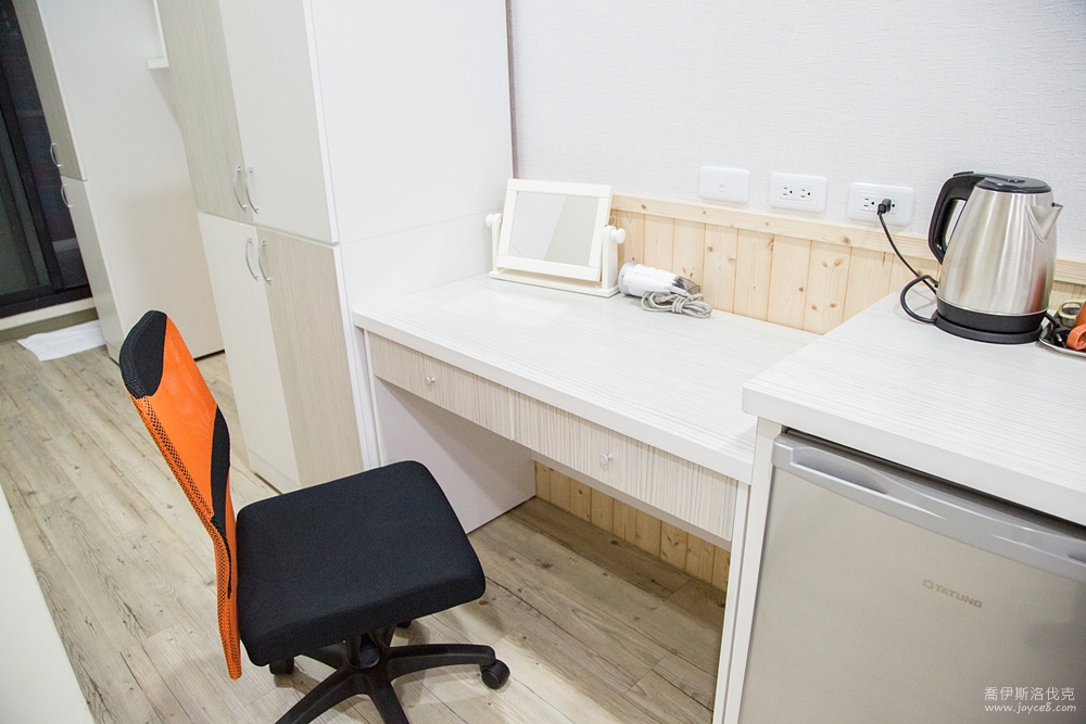 小冰箱以及書桌,這其實已經算是租屋規格了,我如果還是大學生,租到這樣的房間一定開心到飛起來!乾淨又大間,櫃子也大,收納空間也有,無可挑剔呀。