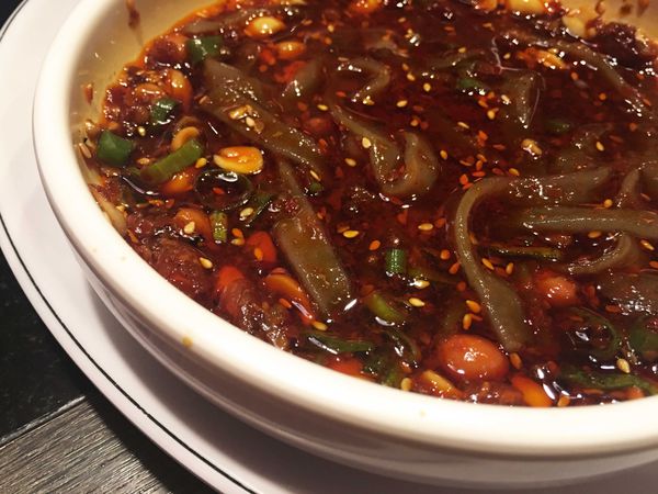來到這裡除了白鍋吸引人之外,必吃的項目就要介紹有些酸辣的這道川味涼粉啦,每桌免費供應一份,四位大人的話一人只能品嘗到一(小)碗,不過如果有不吃辣的同伴,就可以像妹子一樣獨享一大盤了。