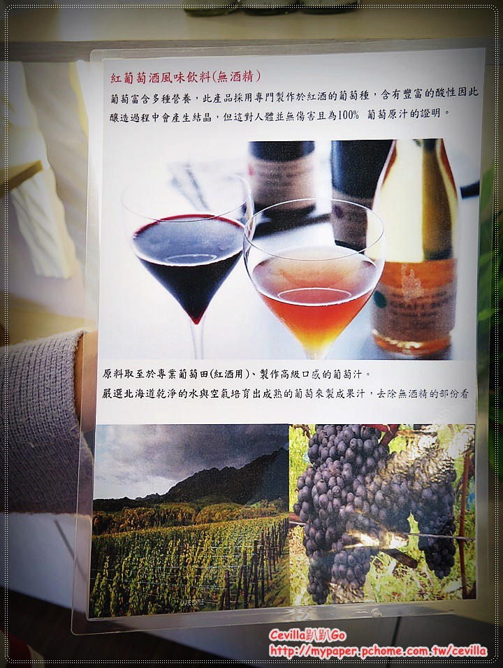 左上角那杯看起來像葡萄酒,其實它是不折不扣的紅葡萄汁喔! 是採用紅葡萄酒的原料,發酵後將酒精去除的純果汁,就連小朋友和孕婦都可以飲用。味道非常香醇好喝,好喝到竟然忘了拍獨照,一點酒精的味道也沒有非常順口好喝。