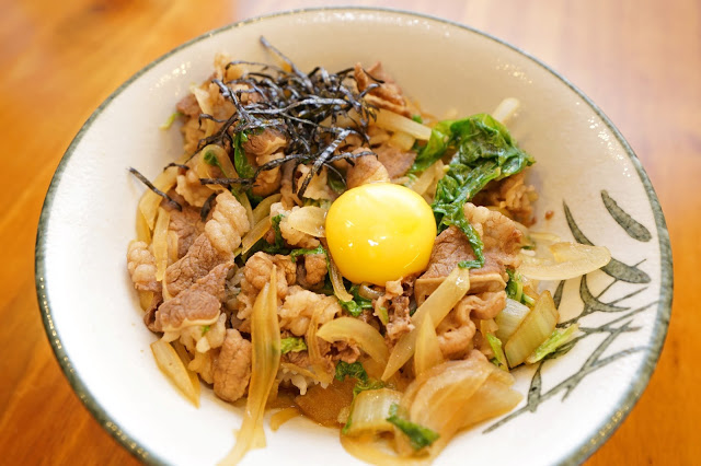 雙饗丼的月見牛丼使用鮮度和部位都不錯的牛肉,肥中帶瘦的肉片口感讓牛丼格外鮮嫩好吃,除了洋蔥還有小白菜的甜脆滋味,比起一般的牛丼,增加了蔬菜的口感,調味上也不會太甜膩,樸實中吃得到食物的真滋味!