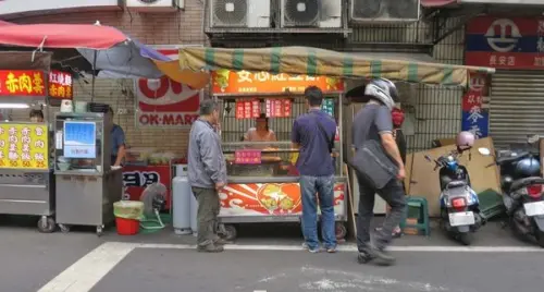 二餅一茶在一間自助餐的前面擺攤,旁邊還有康青龍茶飲