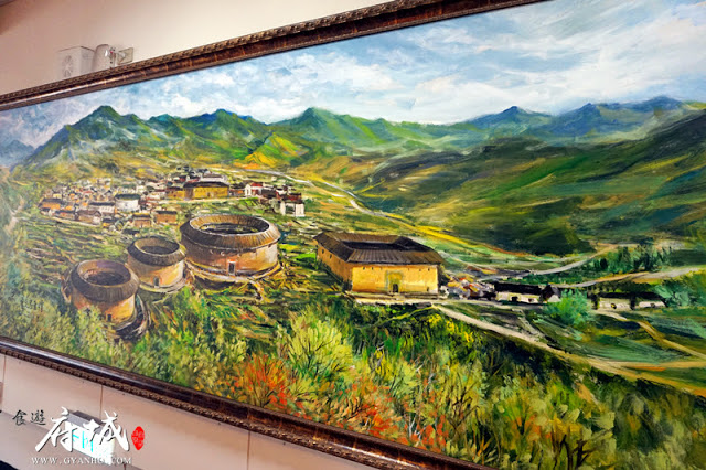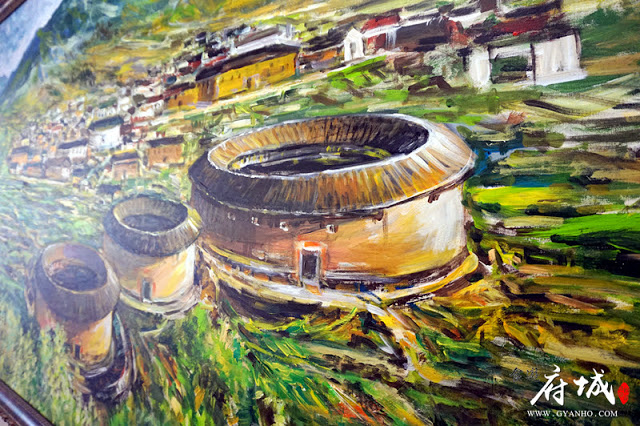 (上下圖:台灣著名繪畫藝術家曾文忠,贈予台南市客家文化會館的畫作《永遠的家園——閩西土樓》)