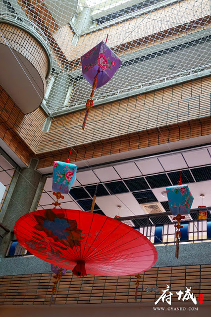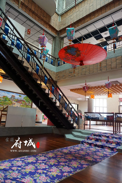 館方用傳統客家花布鋪設地毯,也製成天燈高掛天井,除了裝飾更展現出客家文化紮根台灣的意涵。