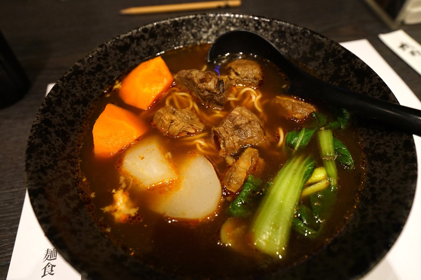 紅白蘿蔔吃得出是煮熟後再放入麵湯裡的,所以吃起來不會太辣,帶著軟透清爽的口感。