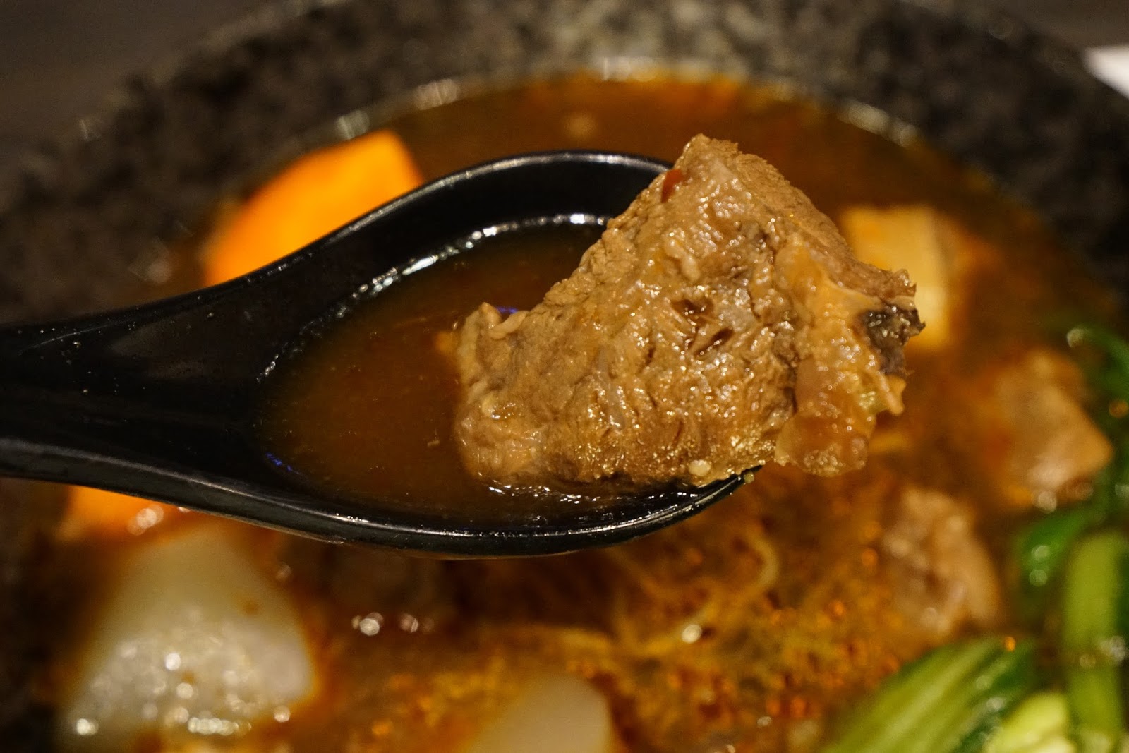 牛腩條燉得軟嫩,相當好吃,小辣的湯頭帶著花椒及中藥的香氣,濃郁的味道,讓人胃口大開。