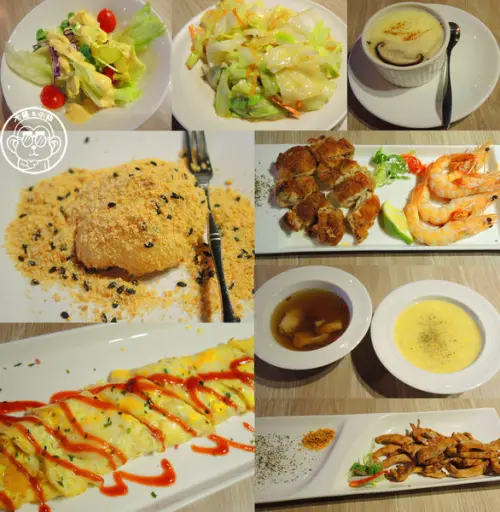 沙拉/湯品(二選二)、季節時蔬、風味米食、和風蒸蛋、法式芝士歐姆蛋捲、