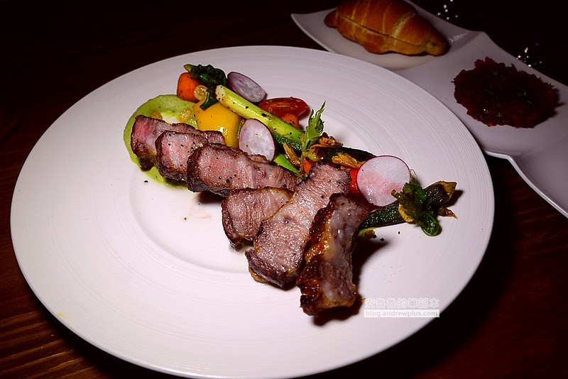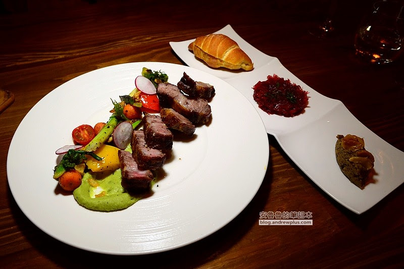 將號稱勞斯萊斯級的豬肉貼心切成適當大小,配上多樣黑胡椒蒜片炒時蔬及帶有薄荷香氣的青醬馬鈴薯泥,成為賞心悅目的擺盤。隨餐還有附上酥脆麵包、混合甜菜根醬汁的自製漬物、由茄子製作而成的蒜茄泥抹醬,都可以搭配油花豐富的軟嫩豬肉一起享用,讓人一次品嘗到多種風味