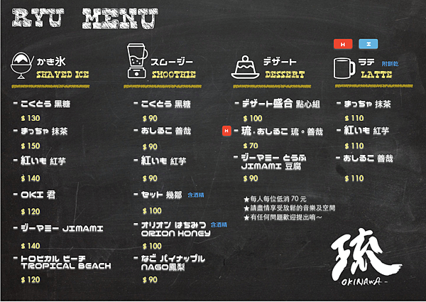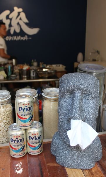 ▲個人很喜歡點餐櫃檯這區的畫面,大大的「琉」字霸氣的當背景,還有櫃檯上的各種裝飾,重點是兩位老闆都滿帥的,感覺得出來他們真的很熱愛沖繩,一位戴著繡有「沖繩」的帽子,一位穿著Orion的t-shirt