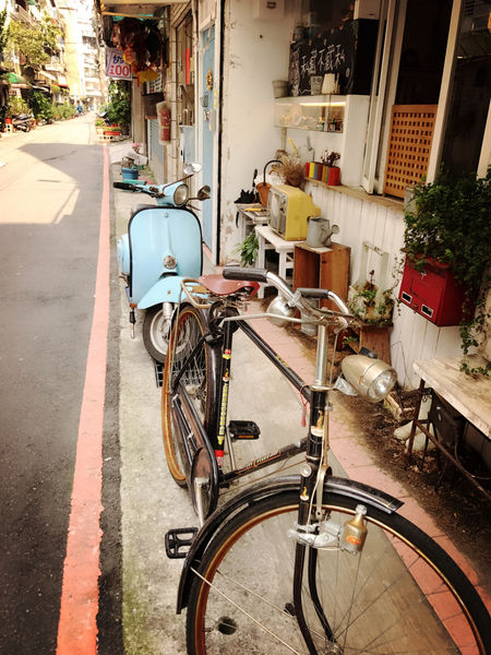 門口停了一台粉藍色的偉士牌跟黑色復古腳踏車搭配著藍色的木門與刷白的窗台,超可愛的風格!