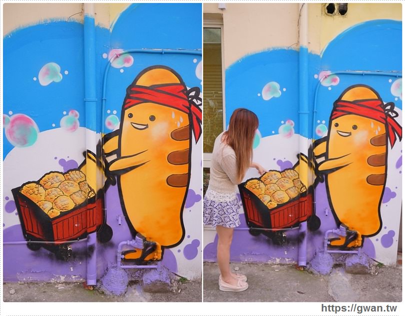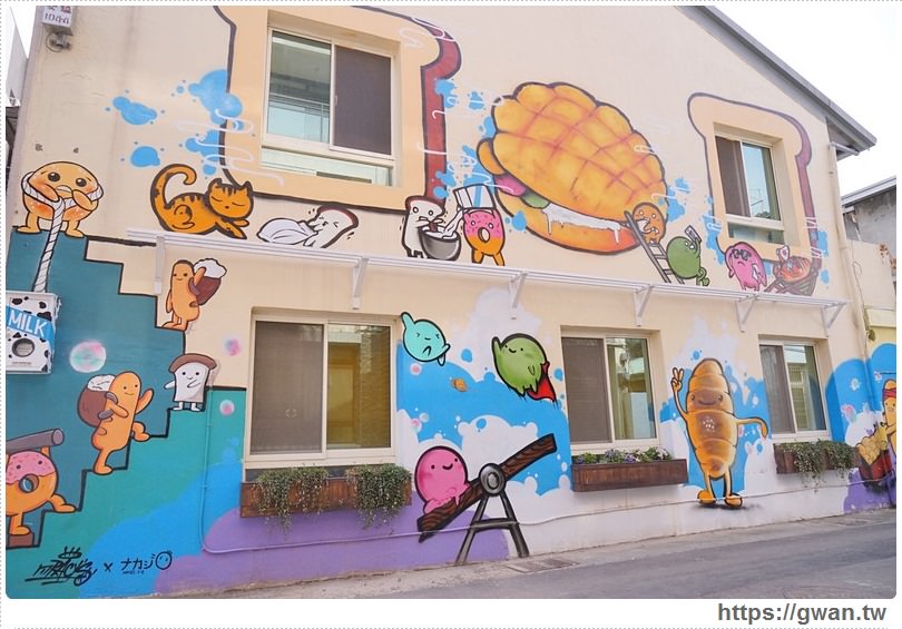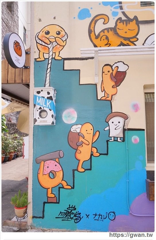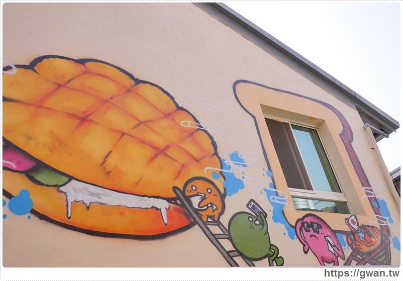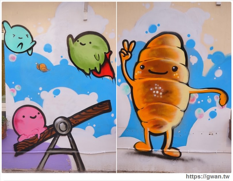 整面牆都是與麵包相關的童趣彩繪 IG上洗成一片啊,哈哈