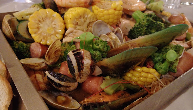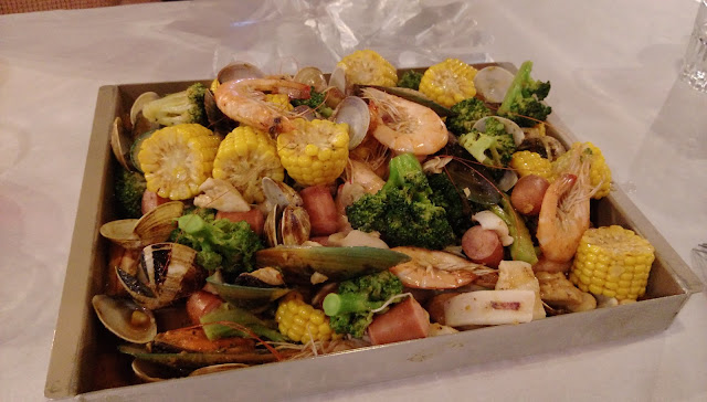 有蛤蠣、大白蝦、淡菜(也就是孔雀蛤)、帆立貝、軟絲、蔬菜*3(杏鮑菇、玉米、青花椰)