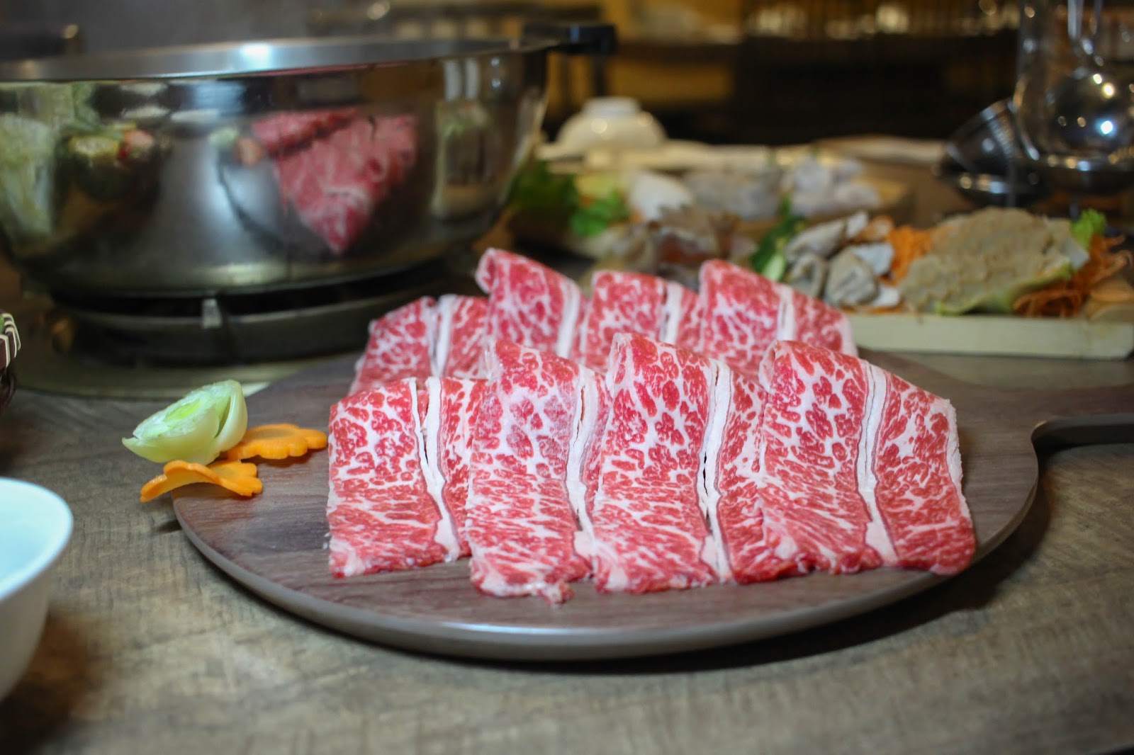 帶著粉嫩色澤的特級牛小排一上桌就吸引我的目光,夾起一片牛小排放入鍋中涮煮幾秒,