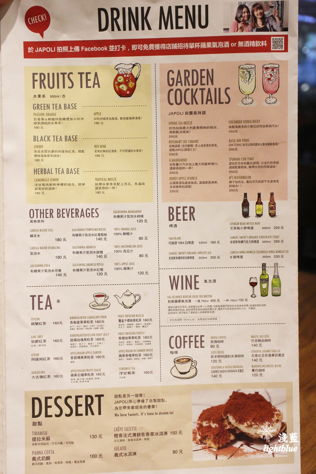 小優惠是拍照上傳臉書打卡可獲得免費蘋果氣泡酒或柳橙汁一杯