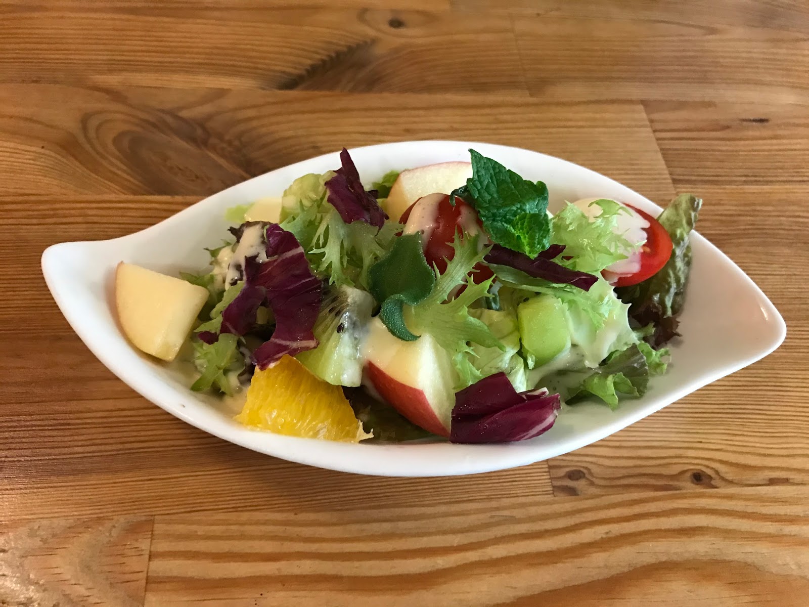 沙拉,裡頭有著許多蔬果,吃完這盤感覺身體好健康