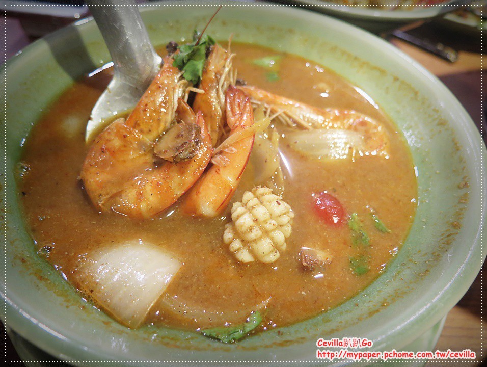 這道酸辣湯和平常喝到的泰式酸辣湯比較不同,朋友一直說這不是酸辣湯,這不是酸辣湯,那是因為一般我們常喝的泰式酸辣湯都是加了酸子煮的,色澤會較清澈味 道偏酸,問了店家他們是加了蝦膏和蝦醬一起煮,味道會比較重,色澤也會比較濃混濁, 剛入喉是海鮮的鮮甜,後面會出現胡椒的辣味和我在清邁喝到的是一樣的味道。