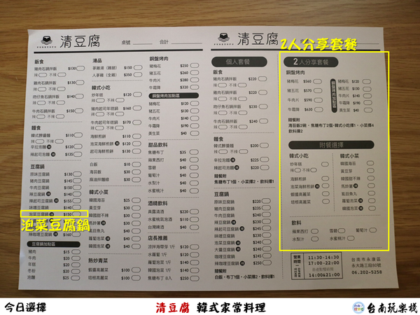 永大路近期開了台南第三間優衣庫路面店,所以來拍照取景時發現棧長總會有新發現,新店雷達的我搜尋到這間清豆腐,從招牌扛棒這樣看來會以為他是賣豆花或豆腐店,要不是旁邊寫著韓式家常菜我可能真的會一直誤會他。棧長前前後後路過此店三次,第一次到來只是拍拍外觀已經被座無虛席的來客數給嚇到,第二次也是如此,第三次我就決定來吃看看了,不然以我的個性要寫食記真的是看心情,因為愛吃不愛寫,所以幾乎吃15餐寫不到一間~哈哈。