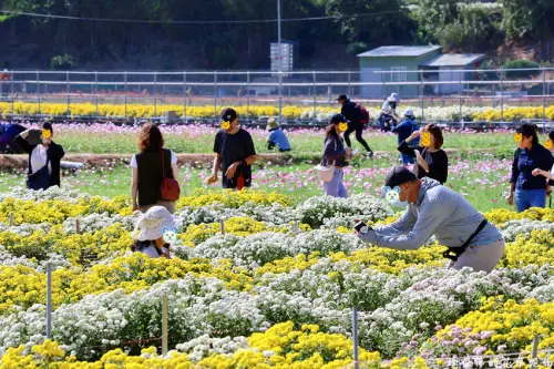 下三義交流道後,依著各方好漢的格子文,就從130縣道由西往東,沿路搜尋李花的蹤跡,但奇怪了,就沒在山裡頭有看到任何一點白花的蹤影!繼續一路往東,終於在大湖聖衡宮旁的關刀山出關步道口看到了白茫茫的一片李花園