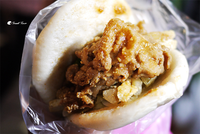 【經典醬爆燒肉】淋上醬、灑上花生粉後的燒肉看起來超誘人的,燒肉的口感上還不錯,不會覺得乾柴,刈包也非常軟Q。