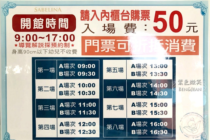 門票:50元(90cm以下免費入場,門票可抵DIY課程費用或商品消費)