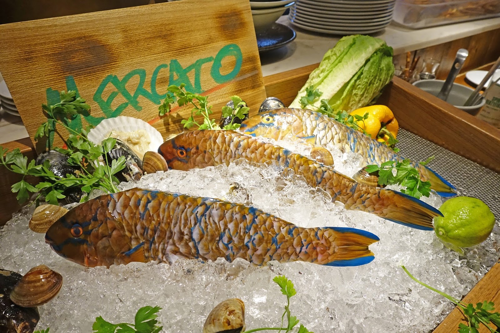 從開放式的廚房,廚師製作餐點的過程非常透明,出餐檯周圍還布置了不少生鮮食材,跟國外的義大利餐廳很相似,都會在玻璃櫥窗擺生鮮魚類吸引大家的注目。