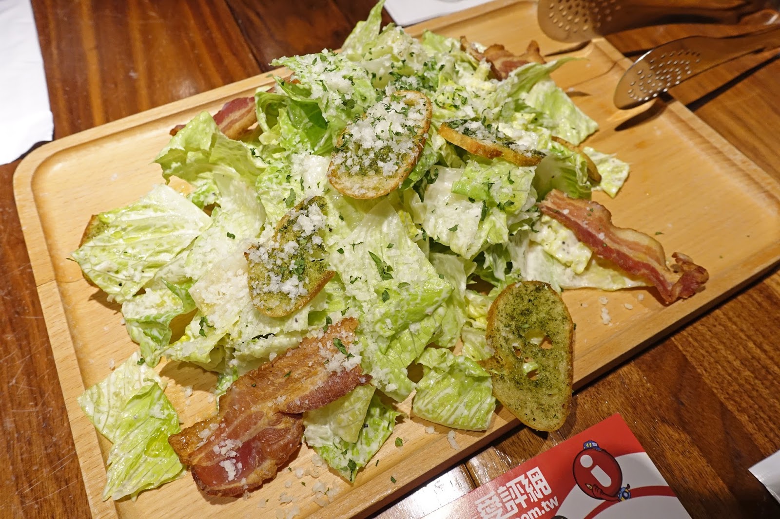 凱薩沙拉豪邁的用整片的培根搭配上桌,每片菜葉都均勻的沾著凱薩沙拉醬,沒有厚重感的醬汁夏天吃起來也很輕盈,上頭撒了不少剛削下的細起司,讓沙拉葉吃起來香氣更好!薄脆的麵包沒有太多調味,僅增加口感的層次!