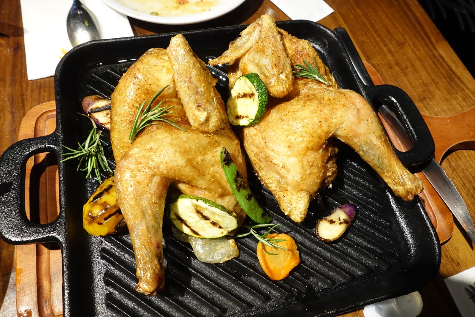 香草烤春雞用的是迷迭香,上面撒著整叢的迷迭香看得出在熱油裡待過,所以把迷迭香的香氣整個引出來,這份春雞一點都不小,以一般餐廳的春雞尺寸來看簡直非常大,足夠四個人分享。