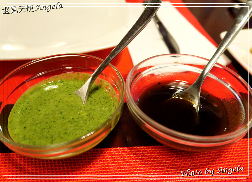 右邊深咖啡色的是羅忘果醬汁,主要拿來沾生菜沙拉用的。話說這個羅忘果醬汁味道真的很不錯,酸酸微甜的味道配上沙拉,一整個很清爽開胃。
