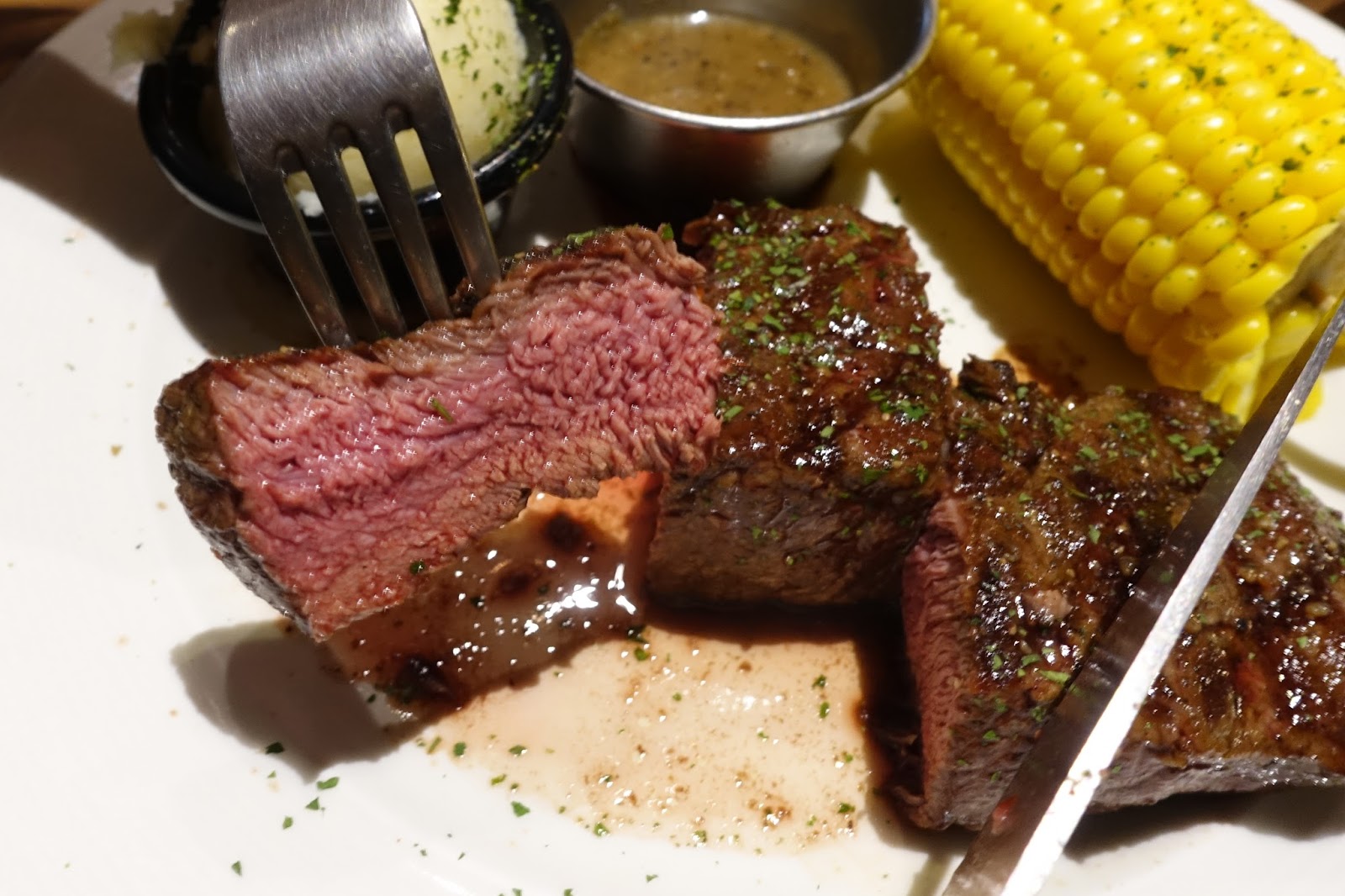 切開後的斷面更是漂亮,五分熟的粉紅色肉質,口感柔嫩好吃,美國牛肉通常口感較為鮮甜、肉質柔軟,史坦利把這份牛排處理得還不錯,但通常舒肥法的牛排切開不會有太多血水,牛排有血水迸出是因為煎或烤好的牛排沒有置放等候10分鐘,就直接切開,比較講究的高價位餐廳會將煎好的牛排先放置十分鐘,上桌前再回鍋中煎1~2分鐘,讓牛排熱騰騰的上桌,這時的牛排切開就不會爆血水。