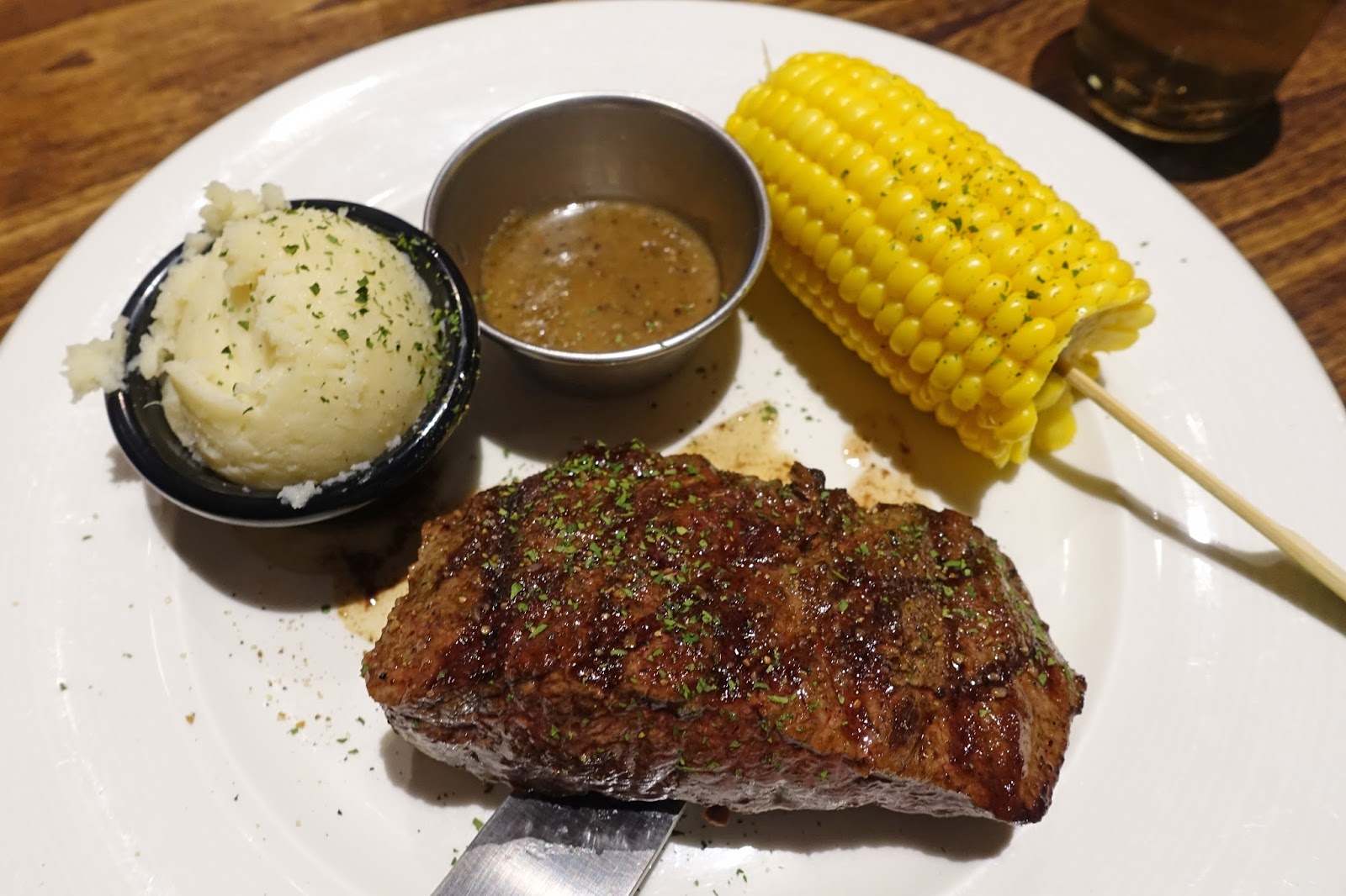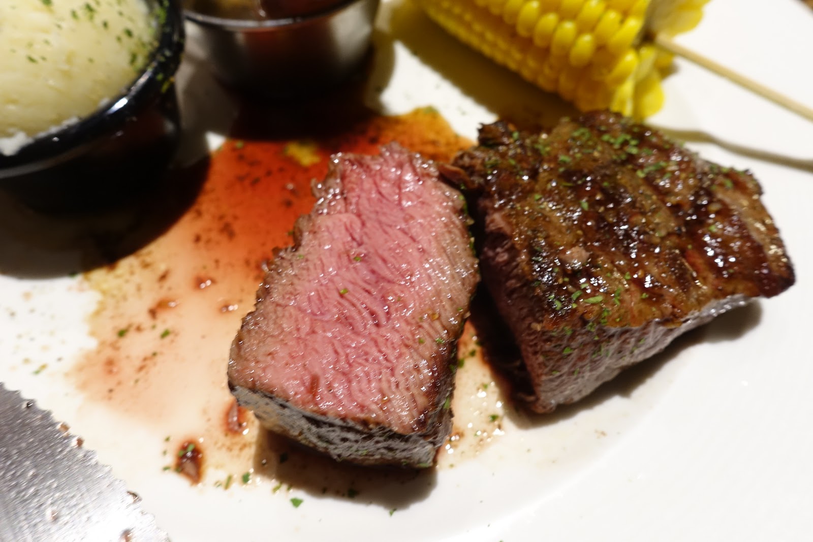 第一次來點了舒肥炭烤美國雪花牛排,可選兩個配菜:薯泥和奶油玉米,牛排一上桌就讓人覺得好美味,牛排的色澤烤得非常誘人,上頭還有漂亮的炭烤格紋,讓人食慾大開啊!
