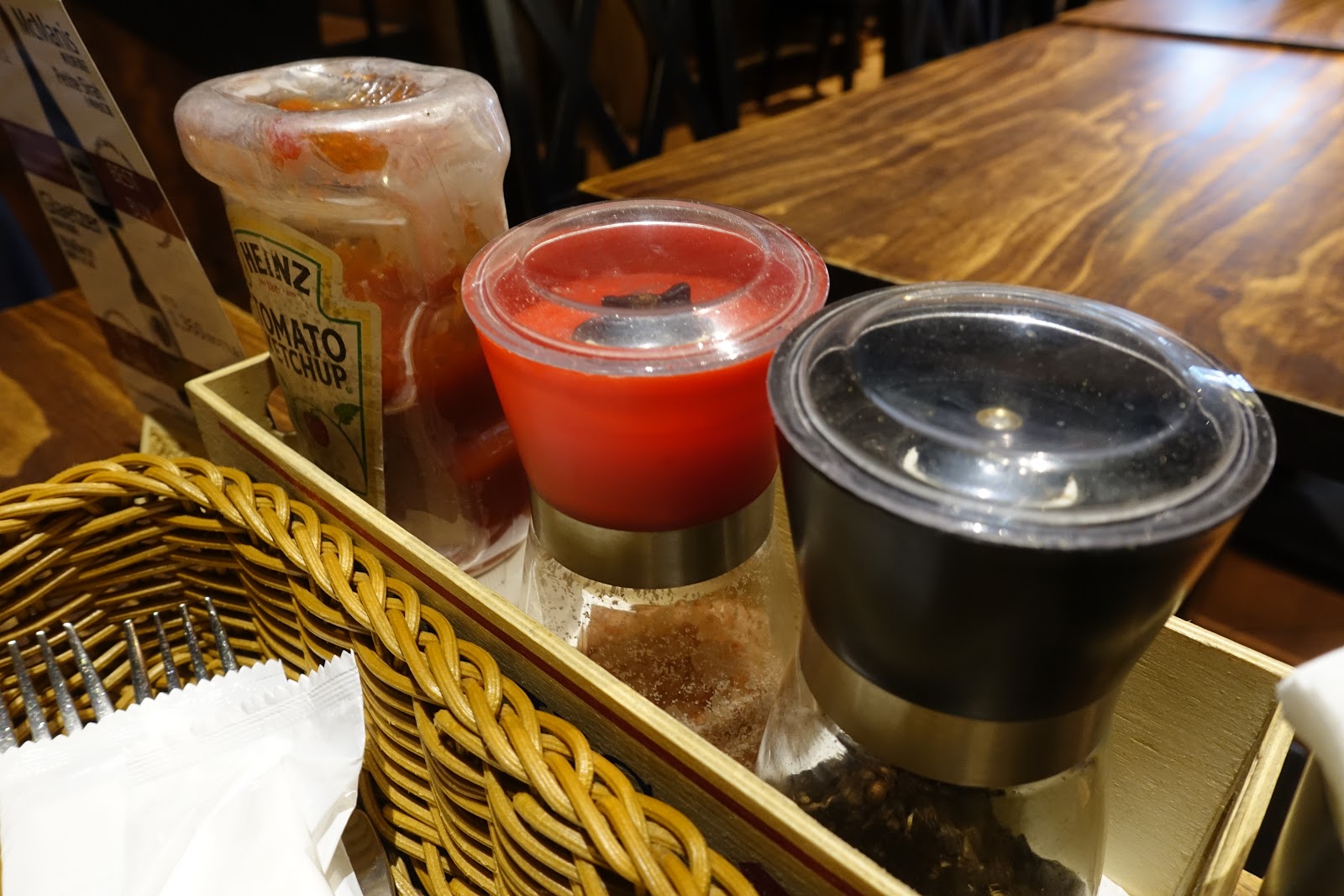 桌上的調味罐有玫瑰鹽、黑胡椒與番茄醬,可依照自己喜好酌量添加。