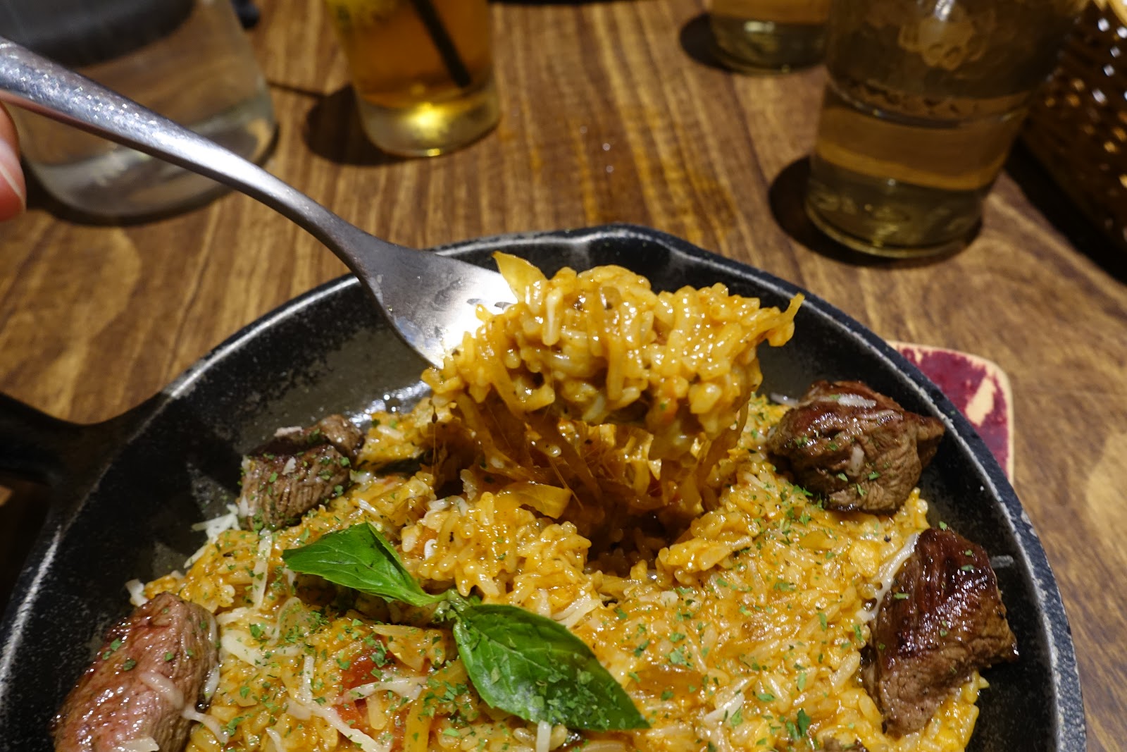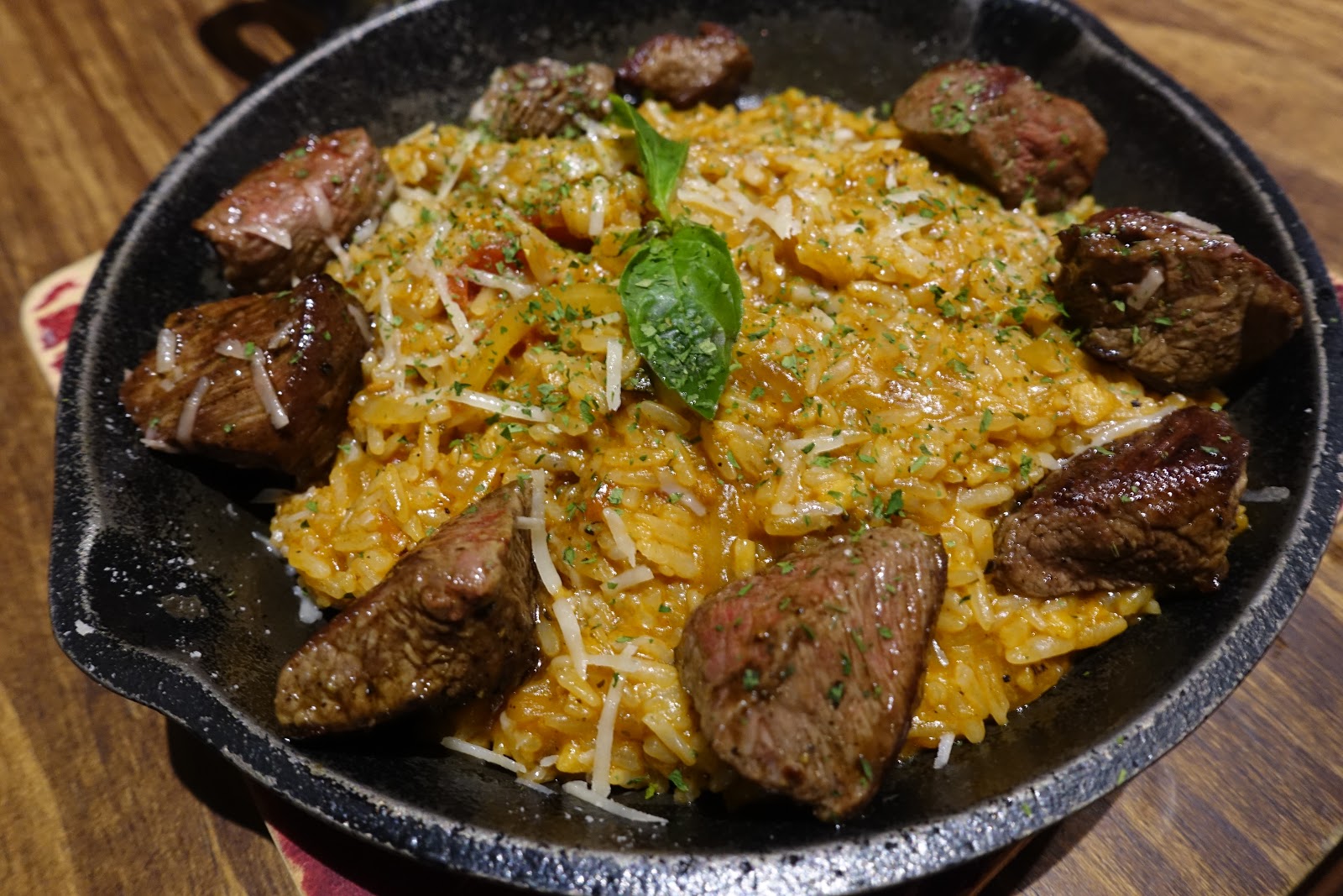 雪花牛排上桌後一會兒,牛排燉飯才上桌,沒能掌握好讓兩份餐點同時上桌有些可惜,點餐時有特別詢問米飯是不是要偏軟,這份米飯偏軟的燉飯口感比較適合台灣人,吃起來很綿密,茄汁的香味均勻的融合在燉飯中,洋蔥絲切得很細很細,和米飯的口感結合得不錯,雖然切小塊去煎的沙朗牛排口感沒有雪花牛排好吃,但熟度控制得也不錯,當中較大塊的牛肉吃起來肉汁緊鎖在肉裡,越咀嚼越香,令人滿意。