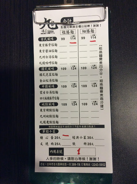 這間拉麵的湯頭很濃唷這間是阿楓上班路上的一間店因為裝潢跟旁邊的店不太一樣吸引到阿楓的眼球囉~價格大概都是99/109加麵會加錢小菜一律都30元芥末杏鮑菇很特別每一種湯頭都有詳細的說明店裡的裝潢也很日式唷阿楓跟阿偉都點東京豚骨我點的是粗面阿偉點的是細麵菜單後記阿楓都吃重口味的所以覺得湯頭還不錯阿偉倒是覺得味道太重了很膩如果試吃清淡口味的人要注意一下唷不過濃郁感阿楓倒是挺喜歡的而且吃完超飽超飽超飽丸湯屋日本拉麵>官方網站<(04)22435052營業時間:11:30~22:00臺中市北屯區興安路一段309-1號喜歡阿楓的文章可以幫忙按個讚或分享唷~想連絡阿楓也可以寄信給阿楓~g199009@gmail.com