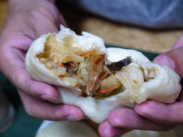內餡超豐富的有高麗菜、蘿蔔絲、木耳絲及素干,一口咬下超爆滿的菜餡,鹹香菜甜超爽口!