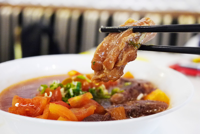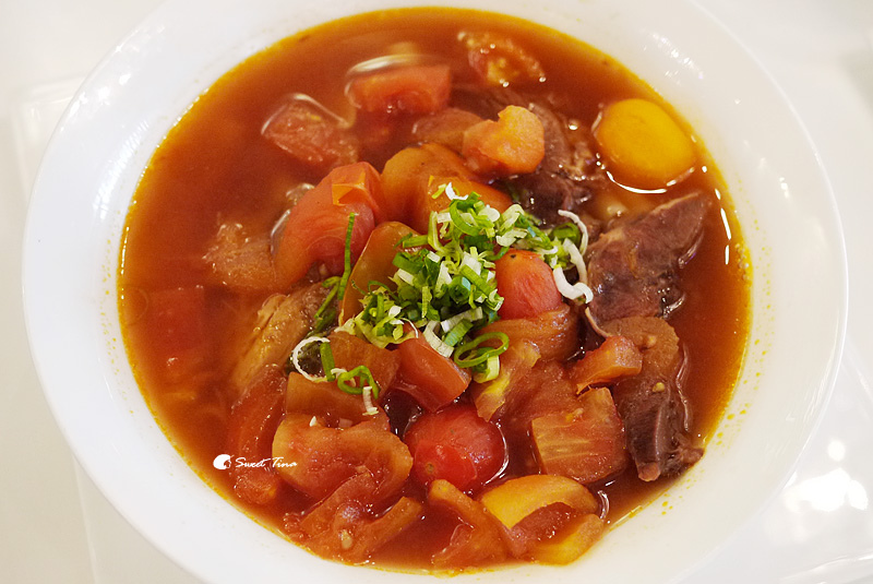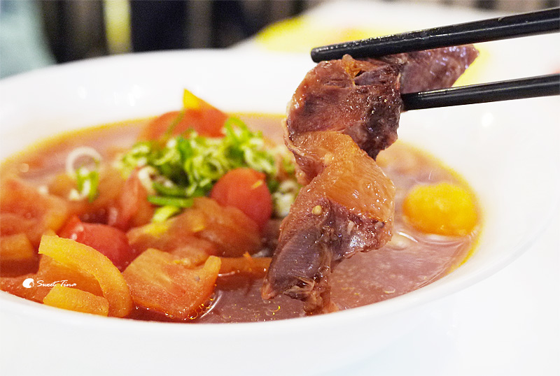 除了湯頭選用四種蕃茄熬煮而成外,上面的蕃茄也有別於一般的店家,是用新鮮的蕃茄簡單川燙後直接淋在上頭,讓品嚐牛肉麵的客人不僅可以吃到熬煮後的黃金湯也可以同時感受到新鮮的味道,所以Tina非常推薦天下三絕的蕃茄湯呢!