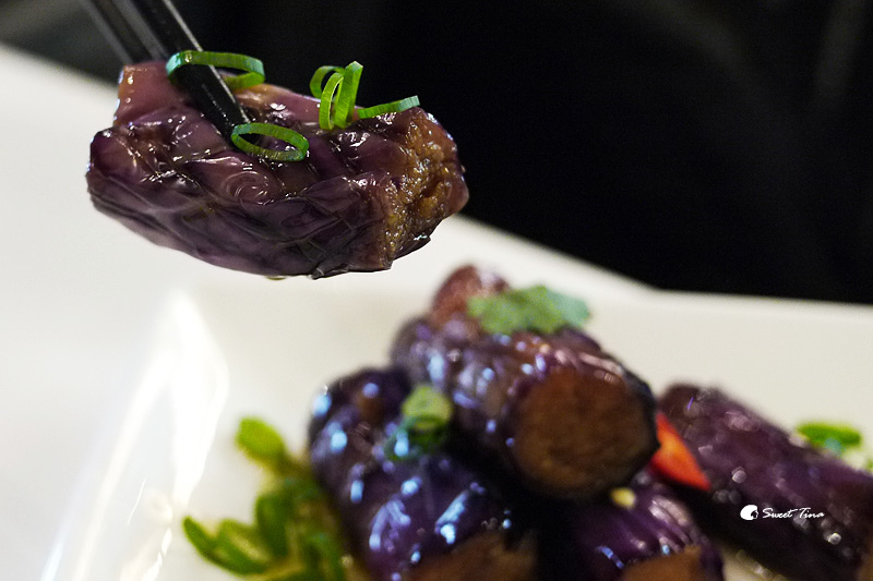 【千張茄子】有別一般茄子調味的方法,特別加入醋一同調味,微酸的口感上也很清爽開胃呢。