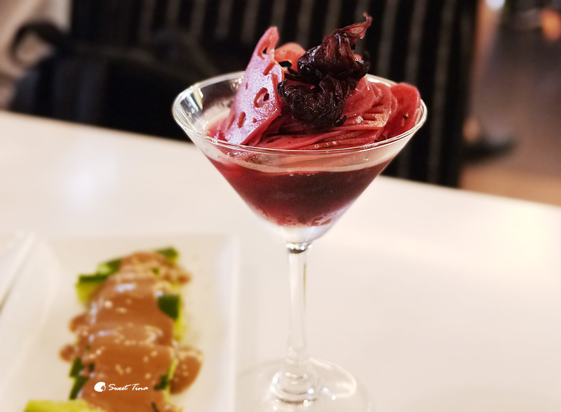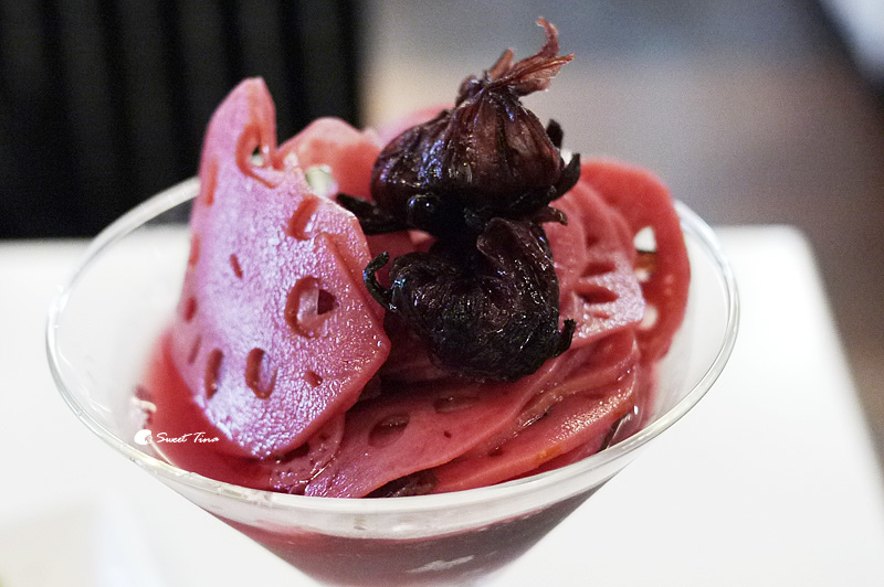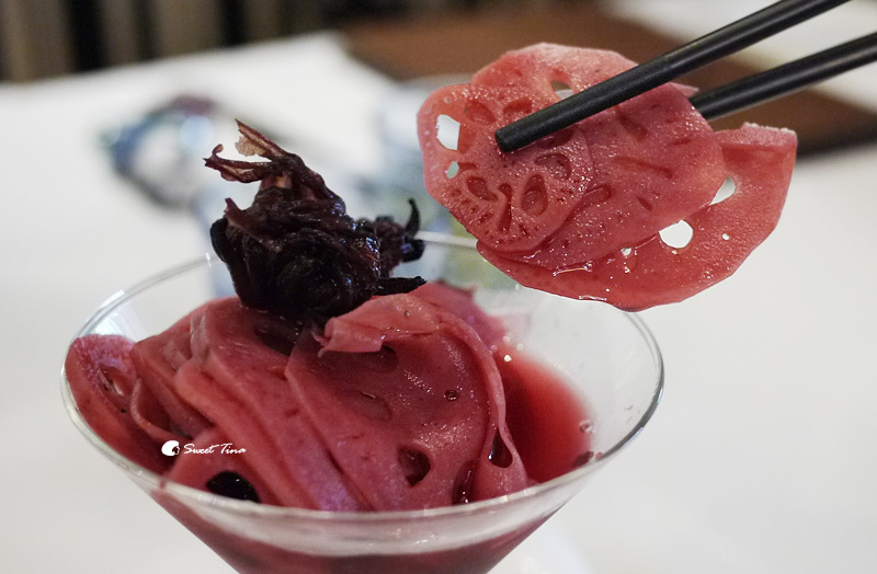 【洛香蓮藕】使用洛神花與蓮藕一同熬煮,酸酸甜甜的口感非常開胃,不僅口感上非常突出美味外,呈現出的樣子也很有質感呢!