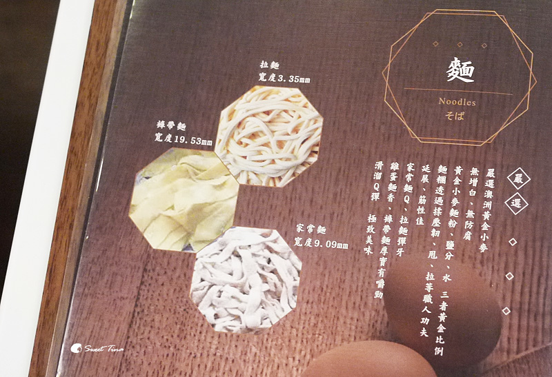 麵條細到粗有 : 拉麵 -> 家常麵 -> 褲帶麵,麵條皆嚴選澳洲黃金小麥,無增白、無防腐,每種都滑溜Q彈呢!