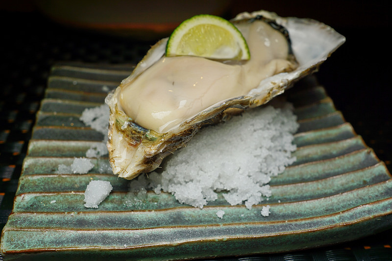 南非生蠔。比起很多日料店愛用的其他品種個頭小些,飽滿,脆甜,海水味低一點較少鹹味, 搭配德島酸桔,甜味會更明顯,搭配FRANCK MASSARD EL MAGO, TERRA ALTA 2014 不錯吃 ( 真的很令人意外喔 XD )