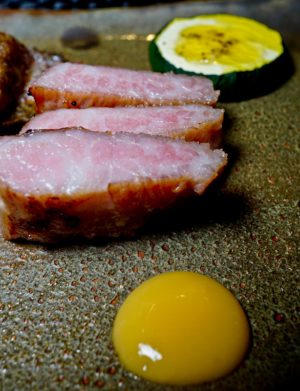 伊比利豬松阪豬以鹽取醃過後低溫舒肥, 口感不錯, 盤面上有黃色的醋味噌