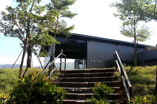 很寬廣的外面,簡單個招牌, 跟建築相比之下 ,銅鑼茶廠 的字真的還蠻小的