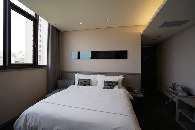 房間呈現簡約的現代感設計,雖然沒有衣櫥但是房間和浴室的空間都不小。
