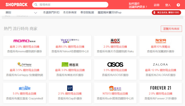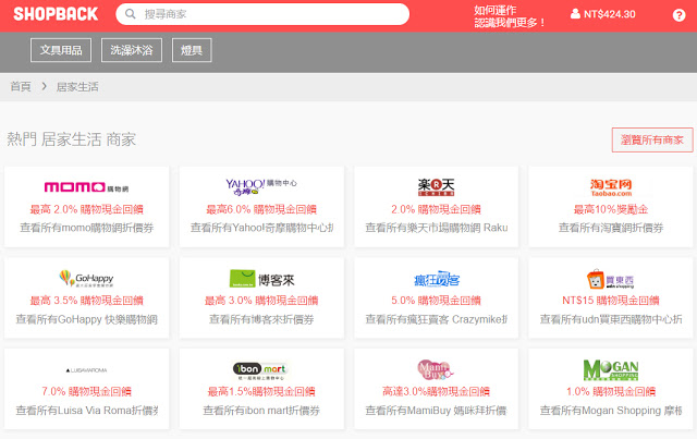 Shopback集結國內外網站有上百家,最常見的奇摩購物中心、博客來通通可以透過Shopback來購物,賺取回饋金!