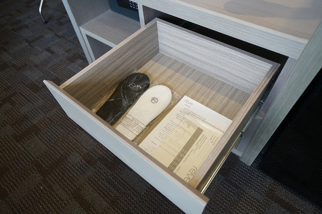 拉開矮櫃的抽屜,裡面準備了拖鞋,櫃子左邊還有保險箱,右側是小冰箱。