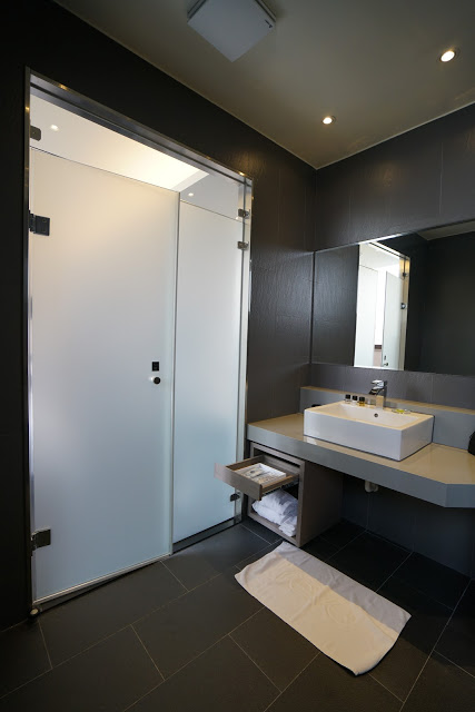 明亮的淋浴間裡有降雨式花灑,也讓我覺得很棒!這間飯店讓我有物超所值的感受。
