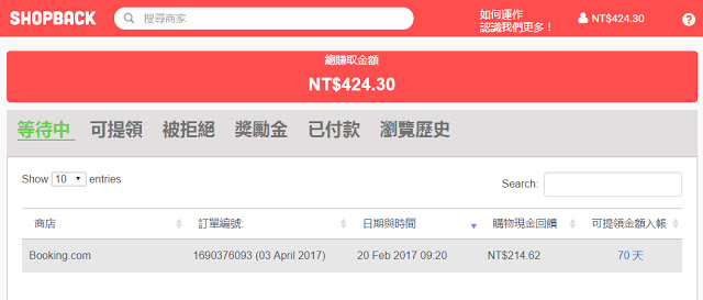 旅行回來後,打開Shopback確認回饋金,再70天就可以入帳囉!以後出門旅行,我都要透過Shopback來訂飯店!