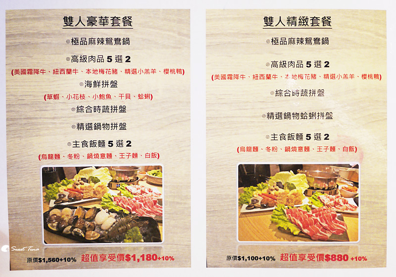 洪爺麻辣鴛鴦鍋 原本是以單點方式提供餐點,但因有客人反應,一樣餐點的份量太多,無法一次品嚐多樣化的餐點,所以近期洪爺也推出套餐的選擇,但大家可以滿足海陸通吃的慾望啊! 不過如果你想單點或加點都還是可以的唷!