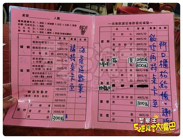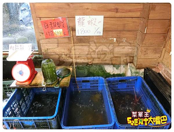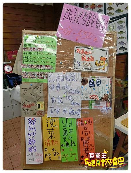 ▲一進到裡面,就會看到許多推薦的菜色:有焗烤龍蝦、白甜蝦、扇貝、九孔、小豬肉、山蘇炒小魚乾、、、等!看得我眼花撩亂,都不知道吃什麼才是王道!