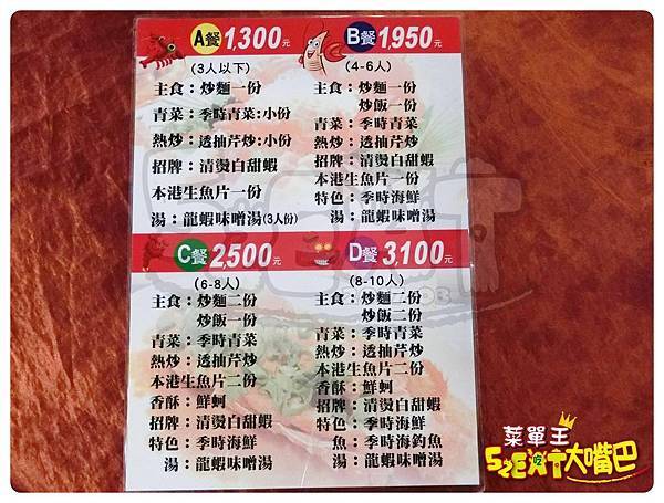 ▲若不知道吃什麼,店家也有推出依「人數」所推薦的桌菜!有A餐3人以下的!B餐4~6人!C餐6~8人!D餐8~10人!價位在1300~3100元左右!