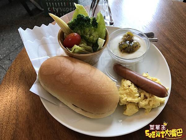 ▲套餐除了沙拉甜點之外還有德式香腸與炒蛋,整體看起來份量並不多,適合吃點心、下午茶的份量。